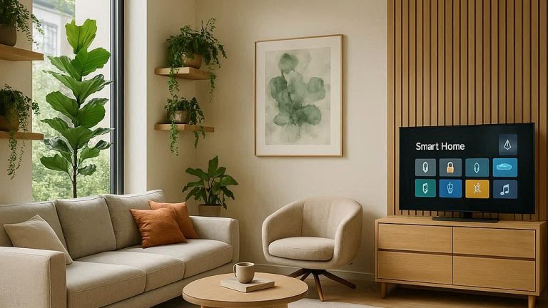 Contemporary home interior featuring sustainable materials, adaptable spaces, and seamless technology integration